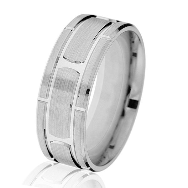 14kt white gold, brick-style, classic, 8mm, comfort fit wedding ring. The center is made with a brush finish and the edges are with a polished finish. Other finishes may be selected or specified. The ring is 8.0 mm wide.