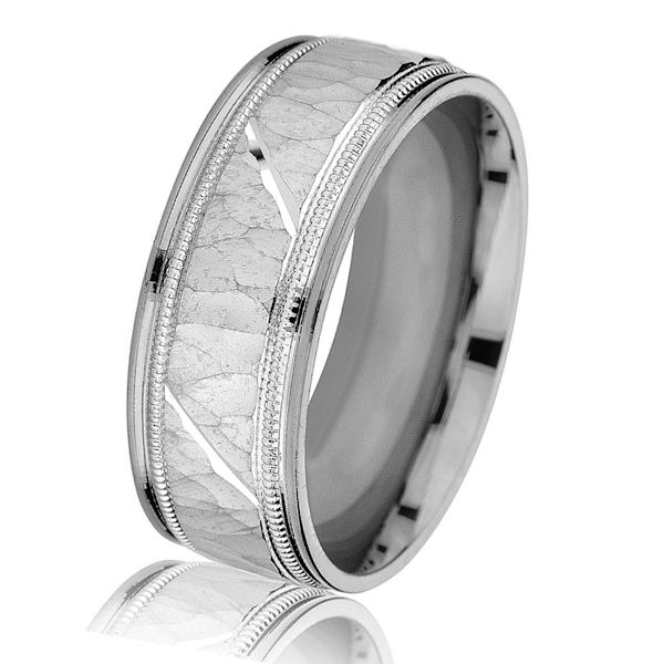 14kt white gold, hammered with milgrain, comfort fit, 8.0 mm wide wedding band. The center has a hammered brushed finish and milgrain accents. The edges have a polished finish. Other finishes may be selected or specified. The ring is 8.0 mm wide.