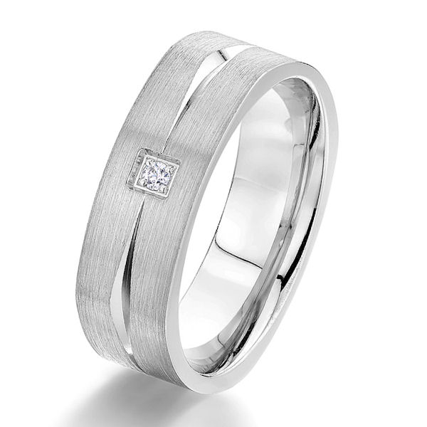 14kt white gold, diamond, comfort fit square men's wedding band. There is one princess cut diamond set in the ring. The diamond is about 0.03 carats, VS1-2 in clarity and G-H in color. Center of the ring has a sandblast brushed finish with the grooves being polished. Other finishes may be selected or specified. The ring is 7.0 mm wide.