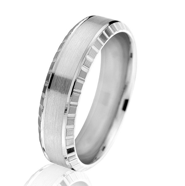 14kt white gold, beveled and designed, comfort fit 6.0 mm wide wedding ring. The center has a brushed finish and the edges are beveled with a designed pattern. Other finishes may be selected or specified. The ring is 6.0 mm wide.