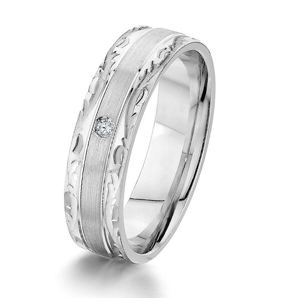 14kt white gold, carved, 6.0 mm wide, diamond comfort fit wedding ring. There is one round brilliant cut diamond set in the ring. The diamond is about 0.02 carats, VS1-2 in clarity and G-H in color. The center of the ring is a brushed finish and the edges have a polished design finish. The ring is 6.0 mm wide.