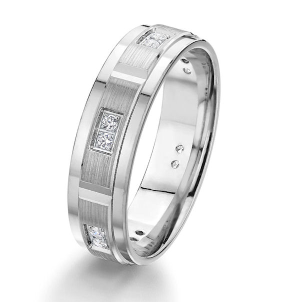 14kt white gold, diamond, comfort fit wedding band. There are 12 round brilliant cut diamonds set in the ring. The diamonds are about 0.12 ct tw, VS1-2 in clarity and G-H in color. The center of the ring has a brushed finish with the edges being polished. Other finishes may be selected or specified. The ring is 6.0 mm wide.