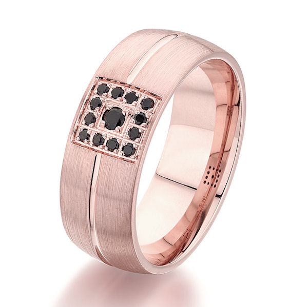 14kt rose gold, diamond, comfort fit wedding ring. There are 13 round black brilliant cut diamonds set in the ring. The diamonds are 0.16 carats total weight. The ring is 8.0 mm wide and has a brushed finish. Other finishes may be selected or specified.