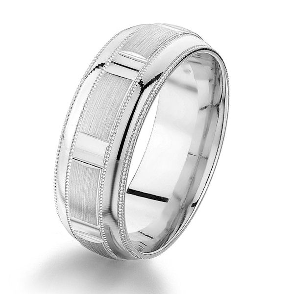 14kt white gold, 8.0 mm, designed, comfort fit wedding ring. The center of the ring has a mix of brushed and polished finish with milgrain accents. The edges are polished. Other finishes may be selected or specified. The ring is 8.0 mm wide.