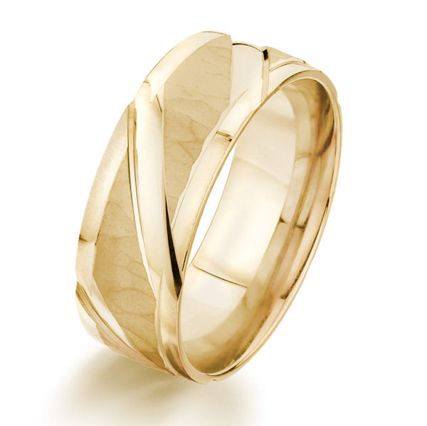 18kt yellow gold, 8.0 mm wide, carved, comfort fit wedding ring. The ring has a mix of hammered brush finish and polished finish. The ring is 8.0 mm wide.