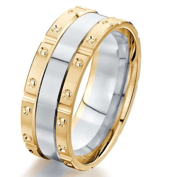 18kt two-tone gold, brick design, 8.0 mm wide, comfort fit wedding band. The ring is all polished. Other finishes may be selected or specified.