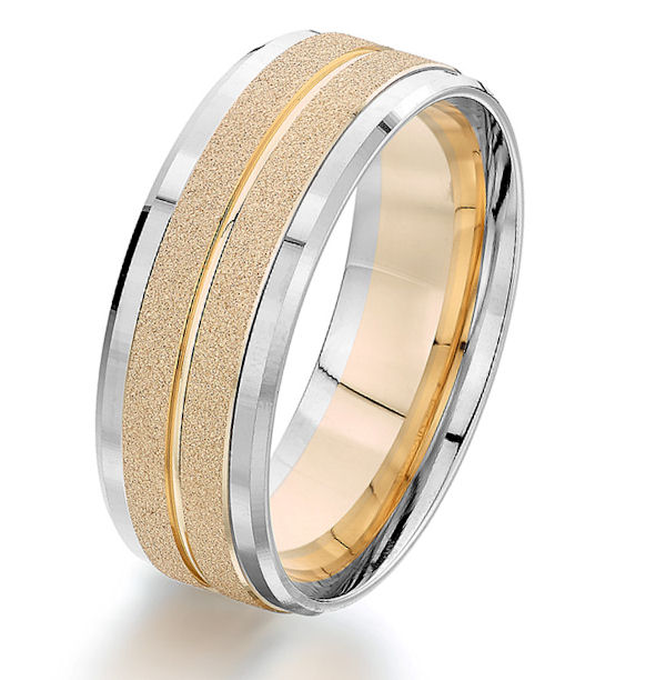 14kt two-tone gold, 8.0 mm wide, comfort fit wedding ring. The center of the ring is yellow gold with a sandblast finish and the edges are white gold with a polished finish. Other finishes may be selected or specified. The ring is 8.0 mm wide.