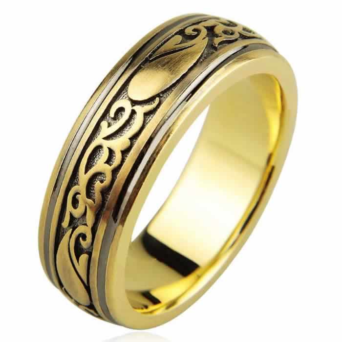 14K two-tone gold 7.0mm wide, comfort fit, black antique wedding band.