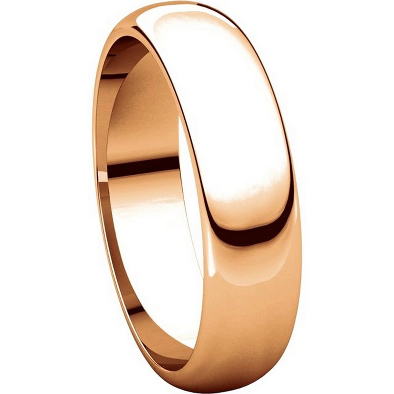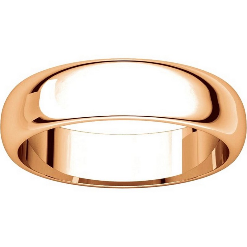 14 kt Rose, gold, high dome, 5.0 mm wide, plain wedding band. The finish on the ring is polished. Other finishes may be selected or specified.