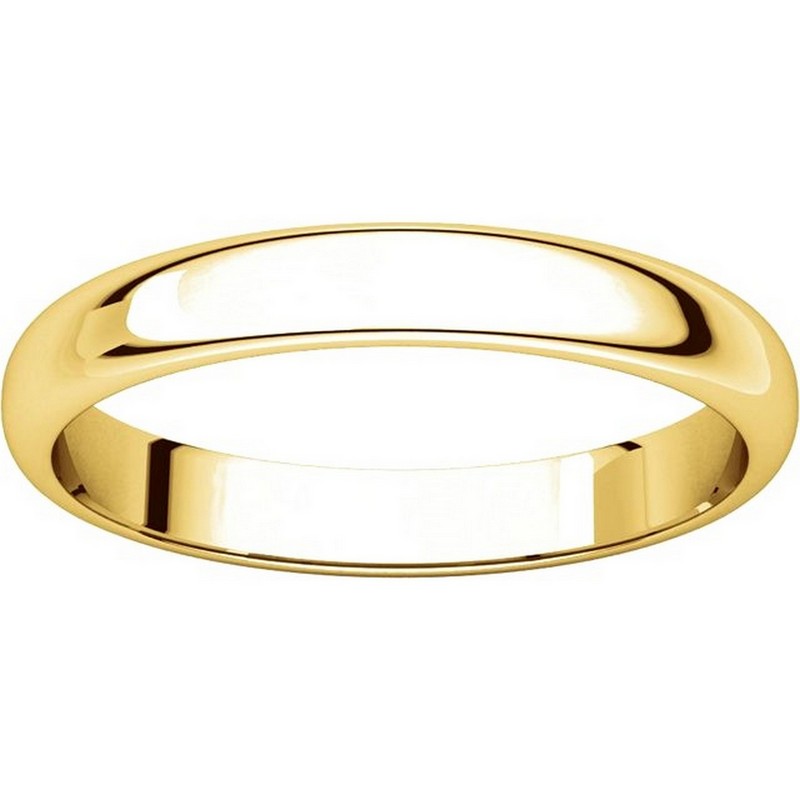 14 kt, yellow gold, high dome, 3.0 mm wide, plain wedding band. The finish on the ring is polished. Other finishes may be selected or specified.