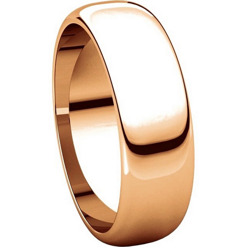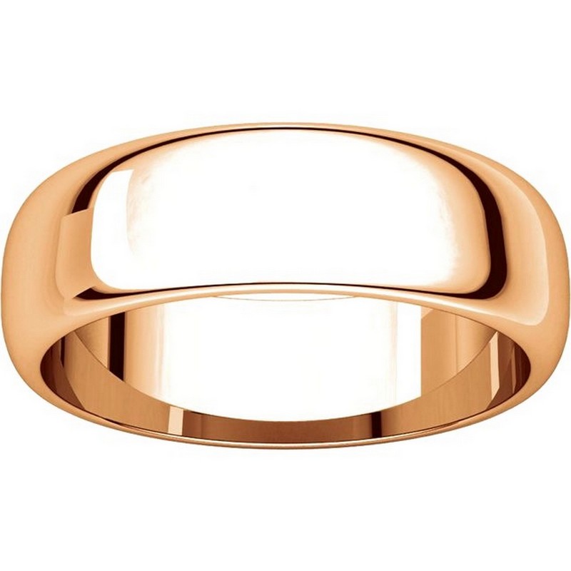 14 kt Rose, gold, high dome, 6.0 mm wide, plain wedding band. The finish on the ring is polished. Other finishes may be selected or specified.