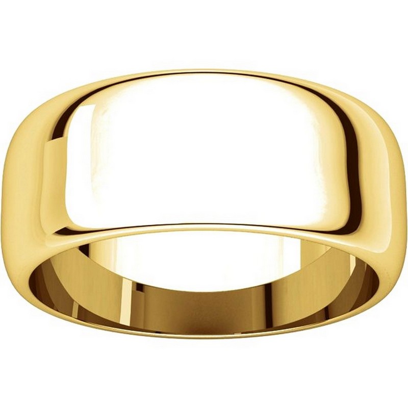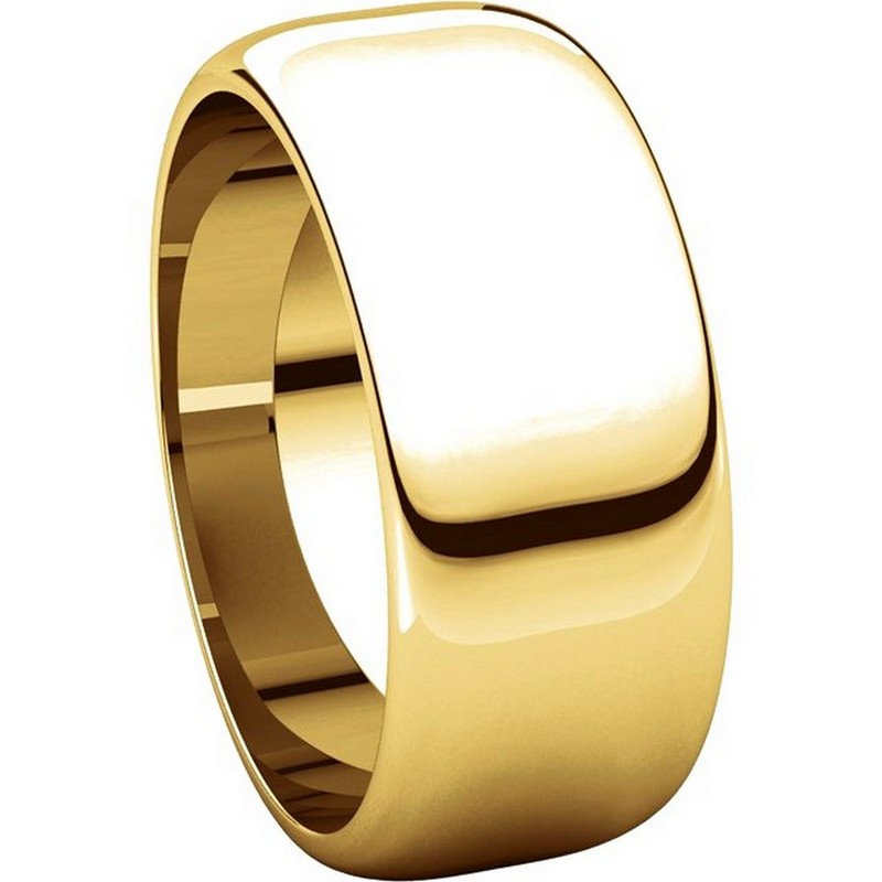 18 K yellow gold, plain high dome, 8.0 mm wide wedding band. The finish on the wedding ring is polished. Other finishes may be selected or specified.