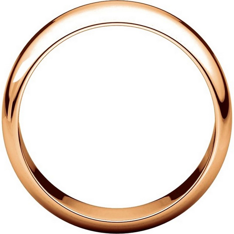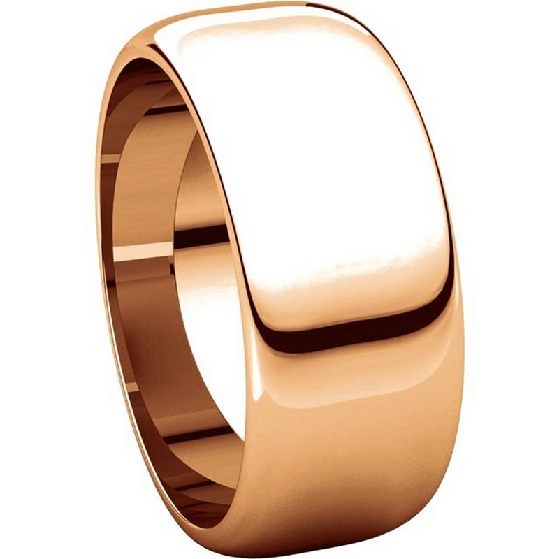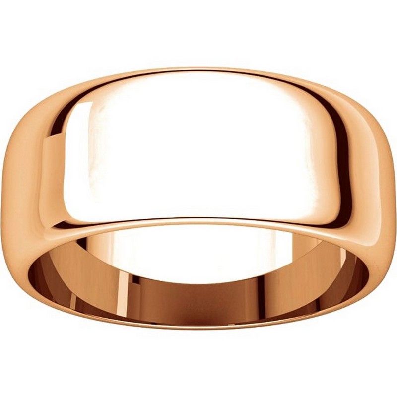 14 kt Rose gold, plain high dome, 8.0 mm wide wedding band. The finish on the wedding ring is polished. Other finishes may be selected or specified.
