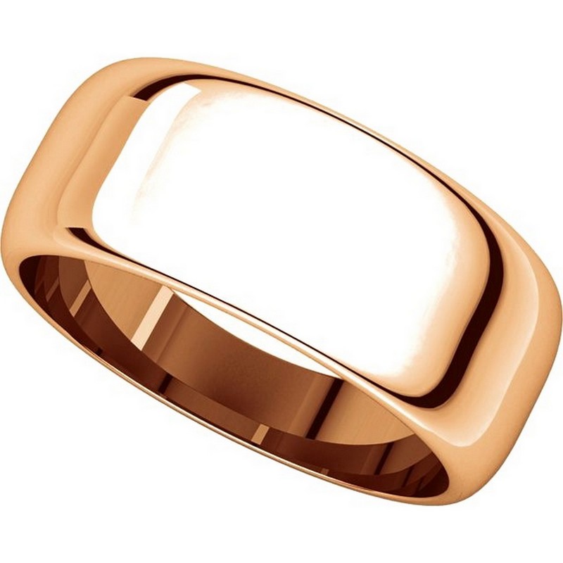 18 kt Rose gold, plain high dome, 8.0 mm wide wedding band. The finish on the wedding ring is polished. Other finishes may be selected or specified.