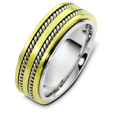 18K gold and platinum, 8.0 mm wide, comfort fit, wedding band. The wedding band is approximately 2.5mm thick rotating center can be made not to spin. There are two hand made ropes inlayed in the center of the ring. The finish on the ring is polished. Other finishes may be selected or specified.