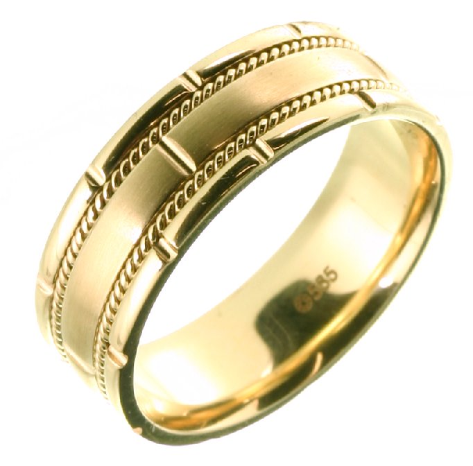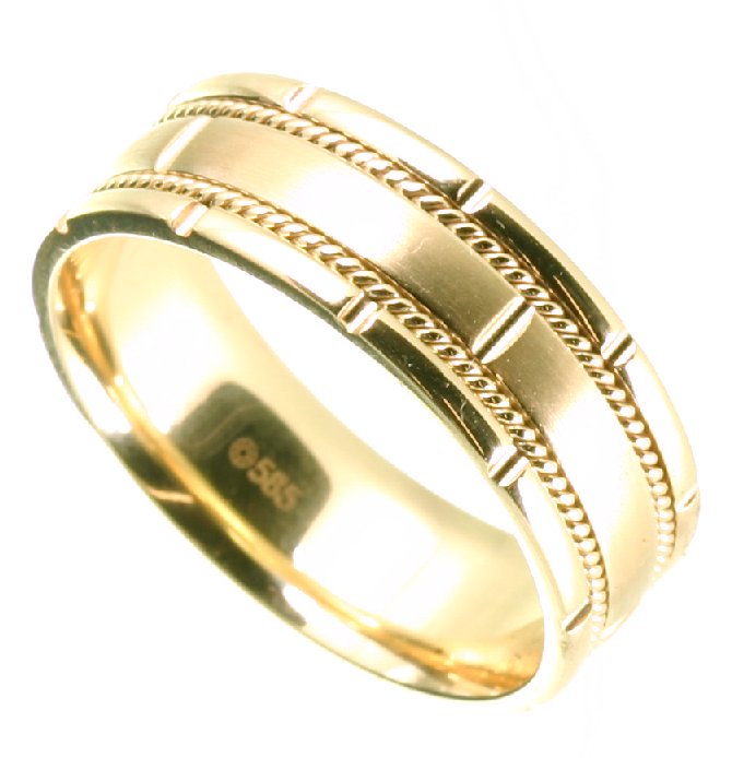 14K white gold with yellow gold twisted wire, 7.5 mm wide, comfort fit wedding band. There are two hand made ropes in the band. The finish on the ring is matte. Other finishes may be selected or specified.