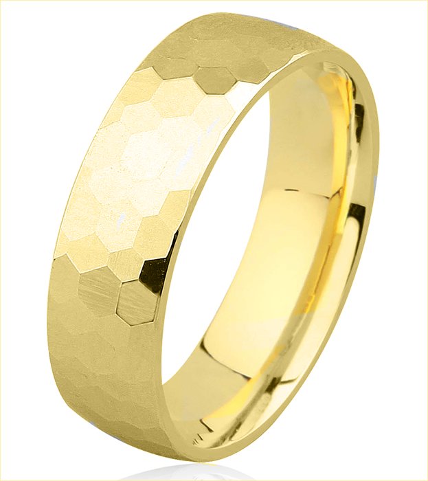 14KT yellow gold hammered 7.0mm wide comfort fit wedding band. Different widths are available