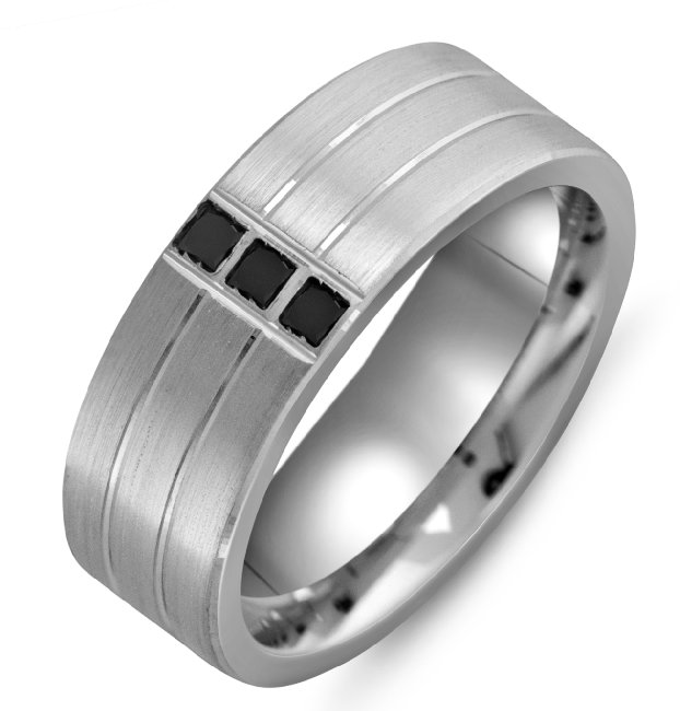 Silver, 8.0mm wide, comfort fit black diamond wedding band. The wedding band holds 3 princess cut black diamonds with 0.15ct total weight.