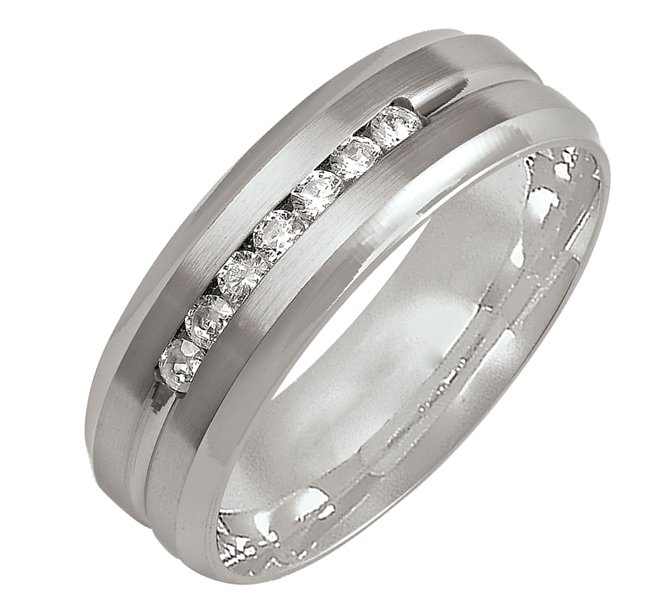 18K white gold, comfort fit, 7.0mm wide diamond wedding band. The wedding band holds 7 round brilliant cut diamonds with total weight of 0.25ct. The diamonds are graded as G-H in color, VS in clarity.