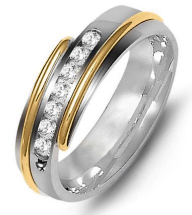 18K two-tone gold, 7.0mm wide, comfort fit, diamond wedding band. The wedding band holds 7 round diamonds with 0.35ct total weight. Diamonds are graded as VS in clarity G-H in color.