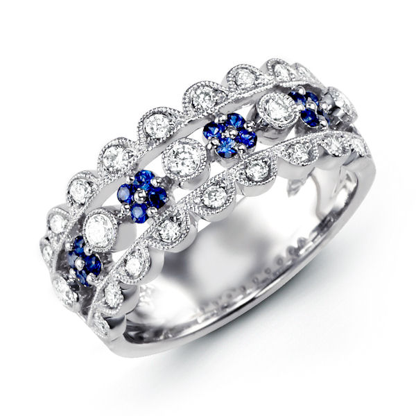 14kt white gold, diamond & sapphire, anniversary ring. There are a total of 84 round stones set in the ring. The diamonds are about 0.38 ct tw, VS1-2 in clarity and G-H in color. The genuine blue sapphires are about 0.21 ct tw.
