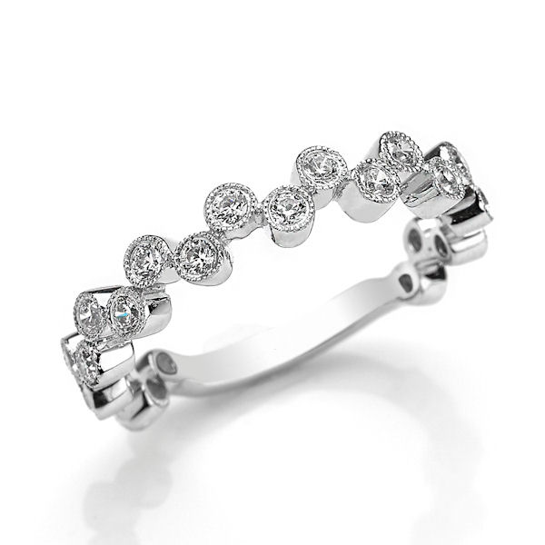 14kt white gold diamond anniversary and stackable ring. There are 22 round brilliant cut diamonds set in the ring with milgrain designs around the diamonds. The diamonds are about 0.50 ct tw, VS1-2 in clarity and G-H in color.