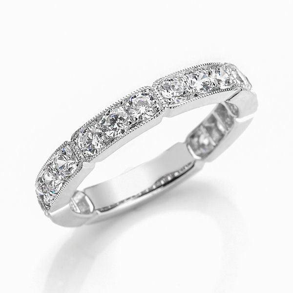 18kt white gold diamond anniversary and stackable ring. There are about 18 round brilliant cut diamonds set in the ring with milgrain edges. The diamonds are about 1.18 ct tw, VS1-2 in clarity and G-H in color.