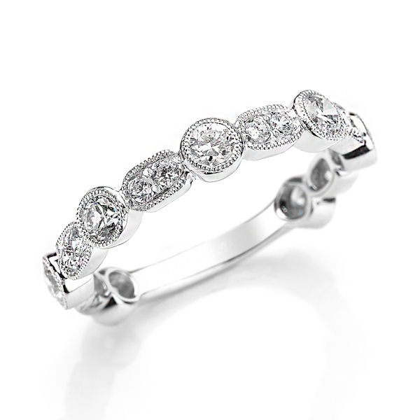 14kt white gold diamond anniversary and stackable ring. There are about 19 round brilliant cut diamonds set in the ring with milgrain edges around the diamonds. The diamonds are about 0.88 ct tw, VS1-2 in clarity and G-H in color.