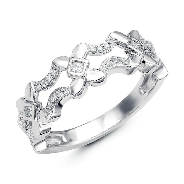 Platinum diamond annivesary and fashion ring which can also be used as stackable rings. There are about 32 round brilliant cut & princess cut diamonds set in the ring. The diamonds are about 0.16 ct tw, VS1-2 in clarity and G-H in color.