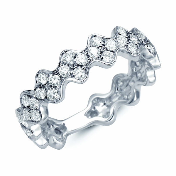 18kt white gold diamond anniversary and fashion ring. There are 52 round brilliant cut diamonds set in the ring. The diamonds are about 0.94 ct tw, VS1-2 in clarity and G-H in color.