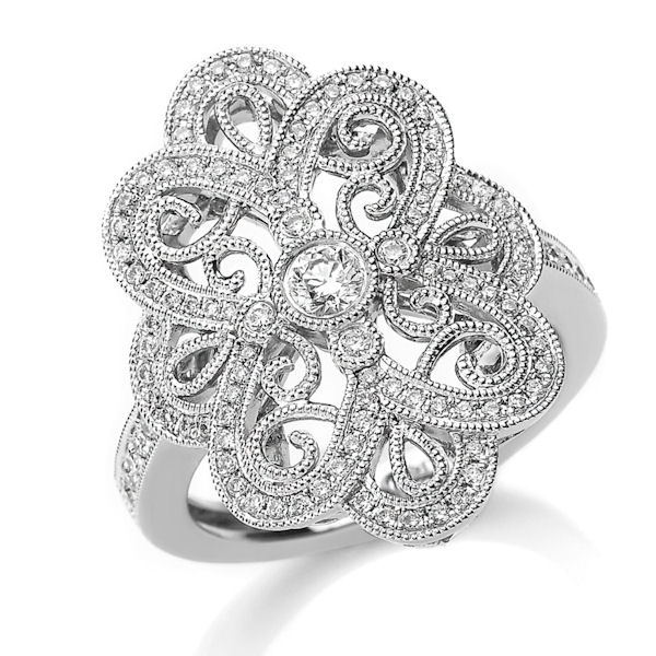 Platinum, vintage, diamond fashion ring with milgrain edges. There are about 105 round brilliant cut stones set in the ring. The diamonds are about 0.50 ct tw, VS1-2 in clarity and G-H in color.