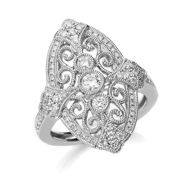 Platinum, vintage, diamond fashion ring with milgrain edges. There are about 75 round brilliant cut diamonds set in the ring. The diamonds are about 0.53 ct tw, VS1-2 in clarity and G-H in color.