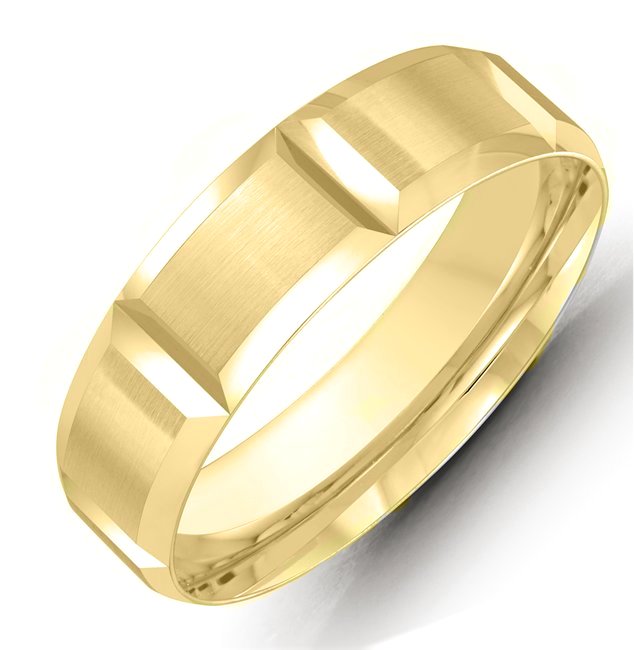 18kt yellow gold 6.0mm wide comfort fit wedding band. The ring is satin finished. Different finishes are available.