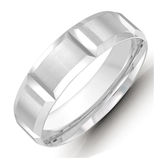 Platinum 6.0mm wide comfort fit wedding band. The ring is satin finished. Different finishes are available.