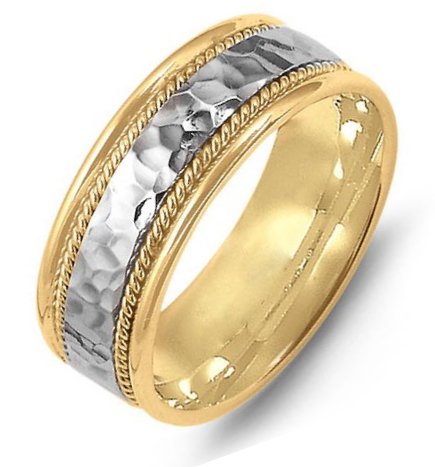 18K two-tone gold, comfort fit, 8.0mm wide, center hammered, hand made wedding band.