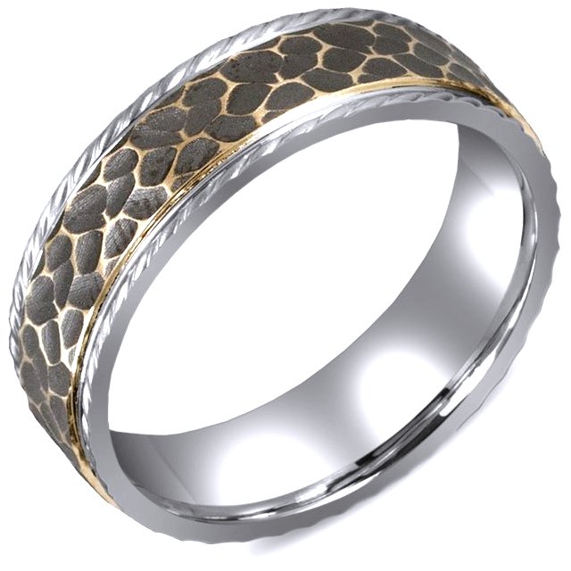 Platinum and 18K gold two tone hammered finish rugged wedding band . The wedding band is comfort fit 7.0mm wide. The design is black antiqued.