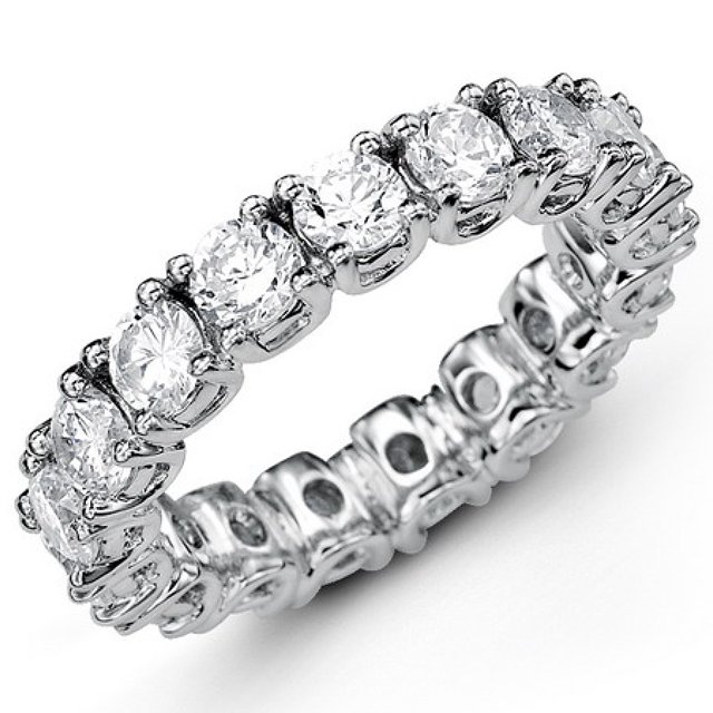 Platinum diamond eternity band. The band set in prongs holds 16 round brilliant cut diamonds with total weigh of 4.0ct in size 6.0. The diamonds are graded as VS in Clarity G-H in Color.