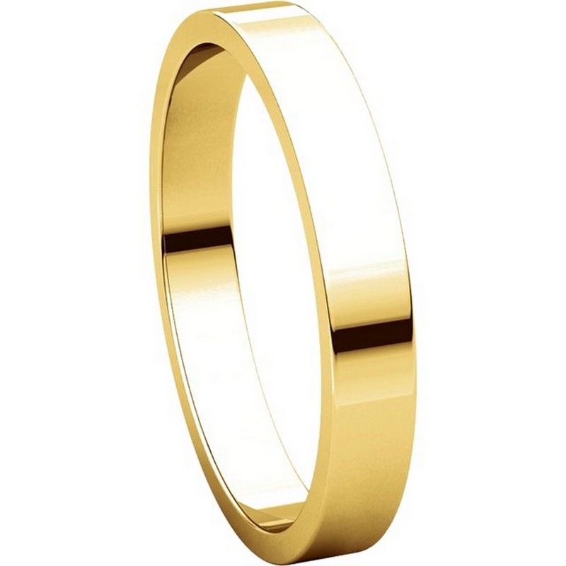 18kt gold, plain, 3.0mm wide, flat wedding band. The wedding band is a polished finish. Different finishes may be selected or specified.