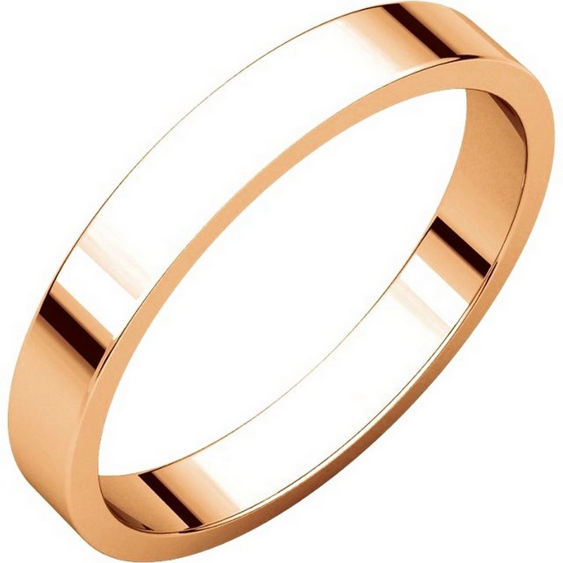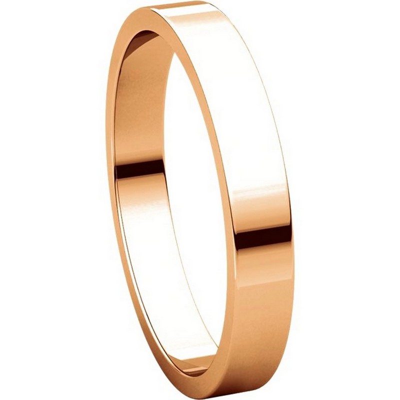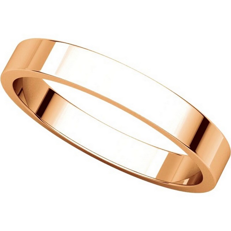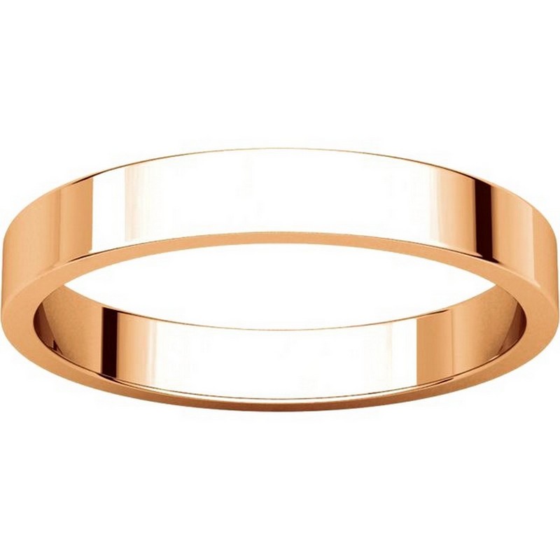 18 kt Rose gold, plain, 3.0mm wide, flat wedding band. The wedding band is a polished finish. Different finishes may be selected or specified.