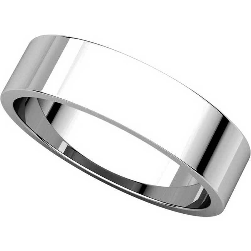 18kt white gold, plain, 5.0mm wide, flat wedding band. The wedding band is a polished finish. Different finishes may be selected or specified.