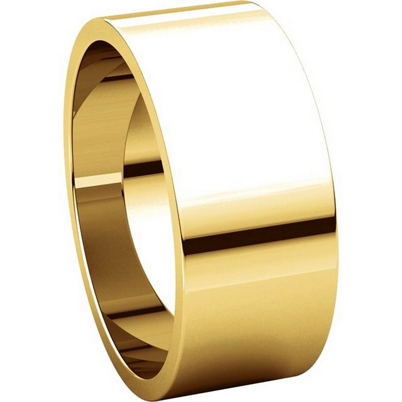 14kt gold, plain, 8.0mm wide, flat wedding band. The wedding band is a polished finish. Different finishes may be selected or specified.
