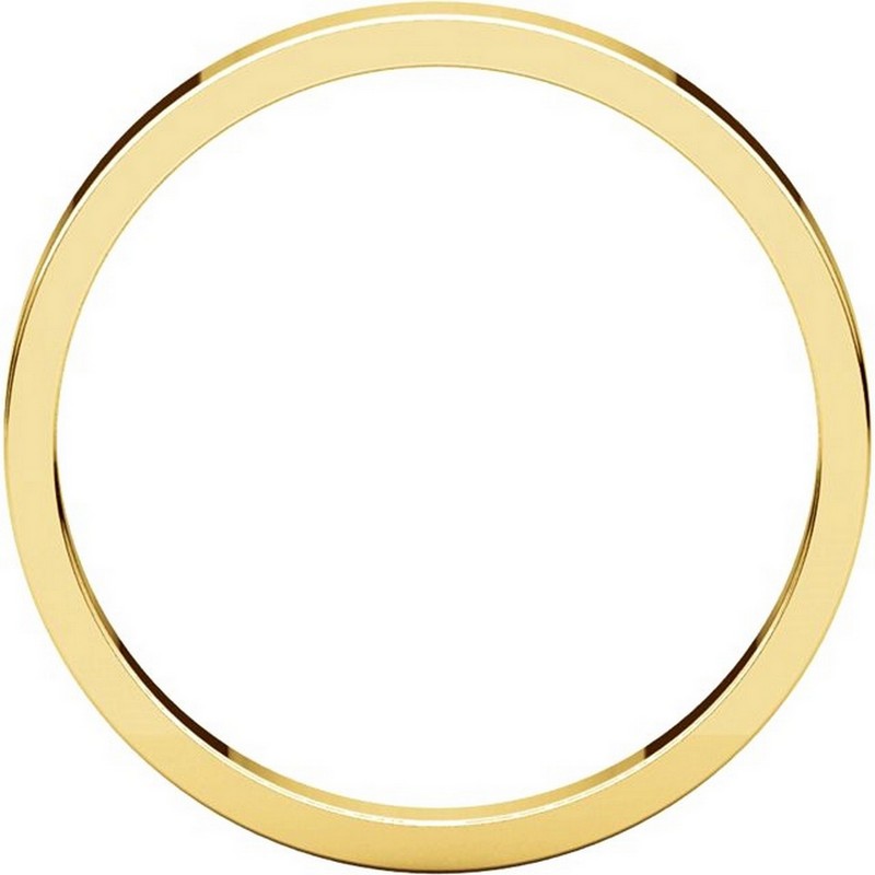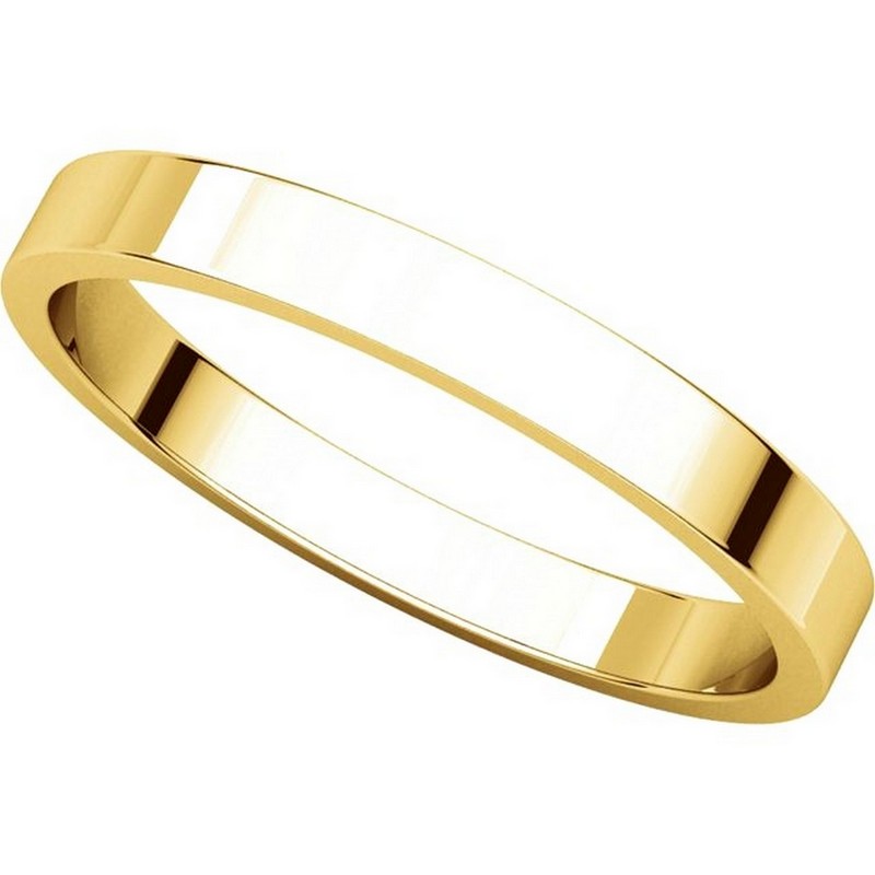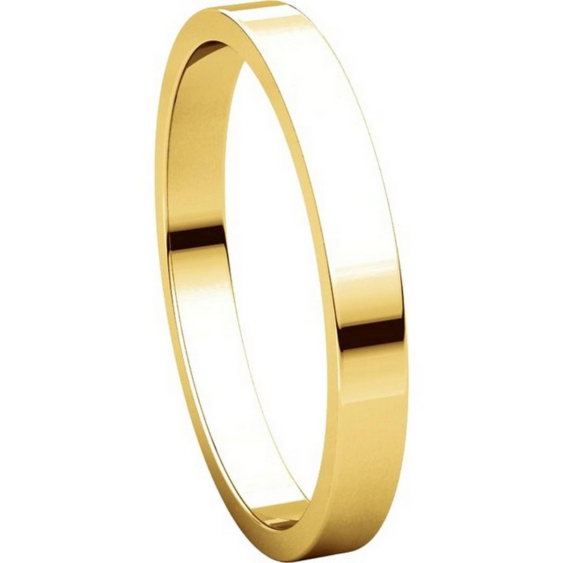 14 kt gold plain 2.5 mm wide flat wedding band. The ring is a polished finish. Different finishes may be selected or specified.