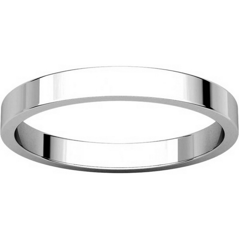 Palladium, plain 2.5 mm wide flat wedding band. The ring is a polished finish. Different finishes may be selected or specified.