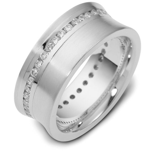 Palladium, 8.0 mm wide, comfort fit, each diamond is 0.02 ct, for a size 6 the total weight is approximately 0.76 ct. Diamonds are VS1 in Clarity and G-H in color. The finish on the ring is matte. Other finishes may be selected or specified.