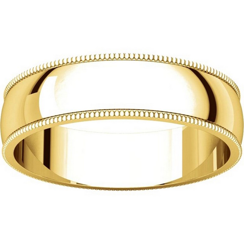 18kt yellow gold, 5.0 mm wide, milgrain edge wedding band. The finish on the ring is polished. Other finishes may be selected or specified.