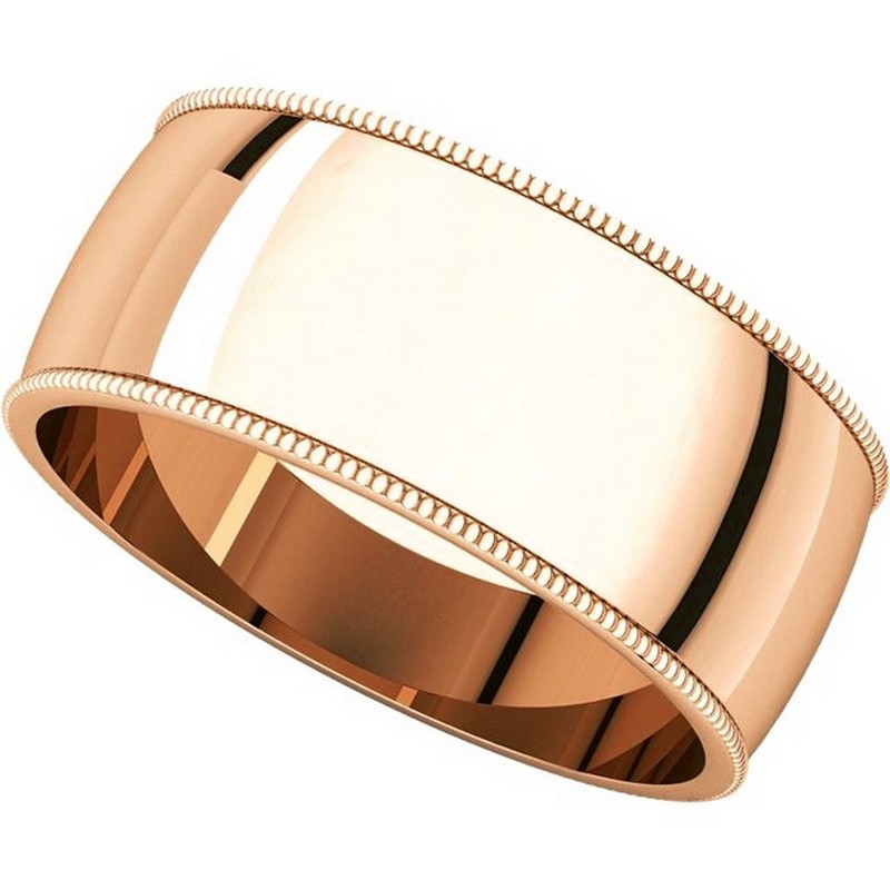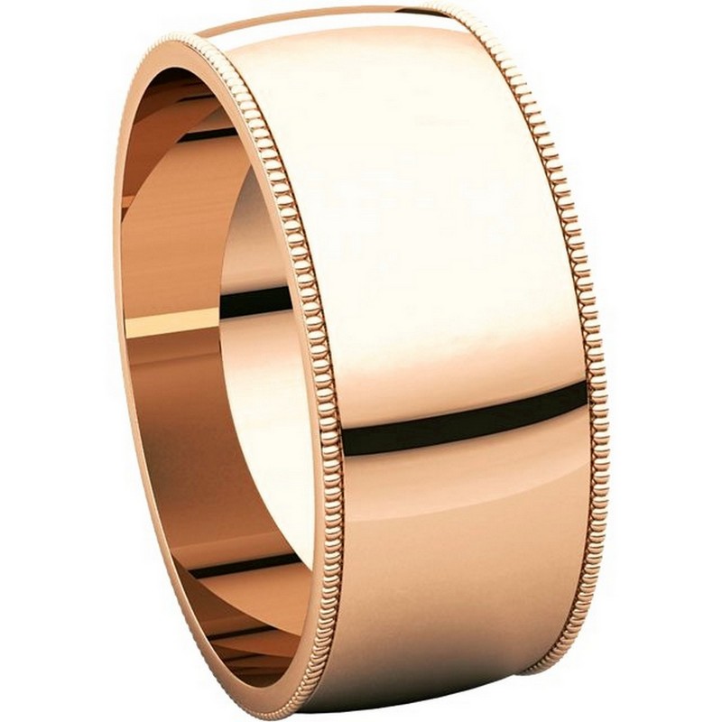 14K Roset gold, 8.0 mm wide, milgrain edge wedding band. The finish on the ring is polished. Other finishes may be selected or specified.
