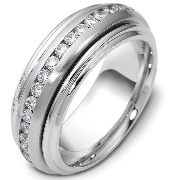 Platinum 8.0 mm wide rotating center, spinning diamond ring, 1.0 ct tw diamonds in a size 6. Diamonds are graded as VS in clarity and GH in color. The center of the ring is matte and the outer edges are polished. Other finishes may be selected or specified.