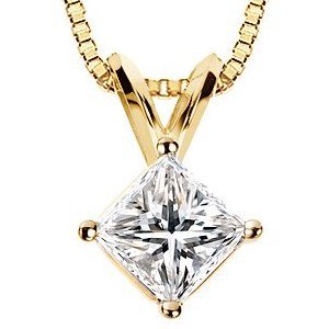 14K gold 0.75 ct princess cut diamond pendant. The diamond is graded as SI1-2 (minimum SI2) in clarity and I in color.