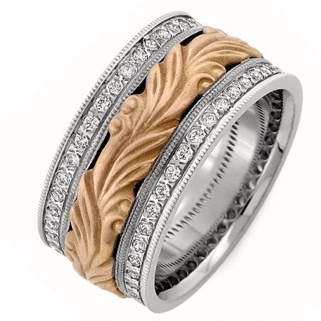 Platinum and 18K gold, hand carved, 10.0 mm wide, comfort fit diamond wedding band. Diamond total weight is approximately 0.80 ct in size 6. The diamonds are graded as VS in clarity and G-H in color. The finish in the center of the ring is a sandblast matte and the outer edges are polished. Other finishes may be selected or specified.