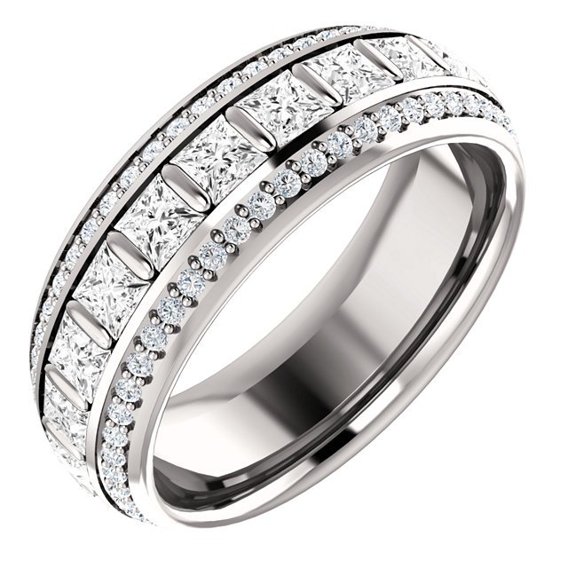 Platinum diamond eternity band. The ring in size 6 holds 22 princess cut diamonds and 100 round brilliant cut diamonds. the diamonds total weight in size 6.0 is approximately 1.87ct. the diamonds are graded as VS in clarity G-H in color.